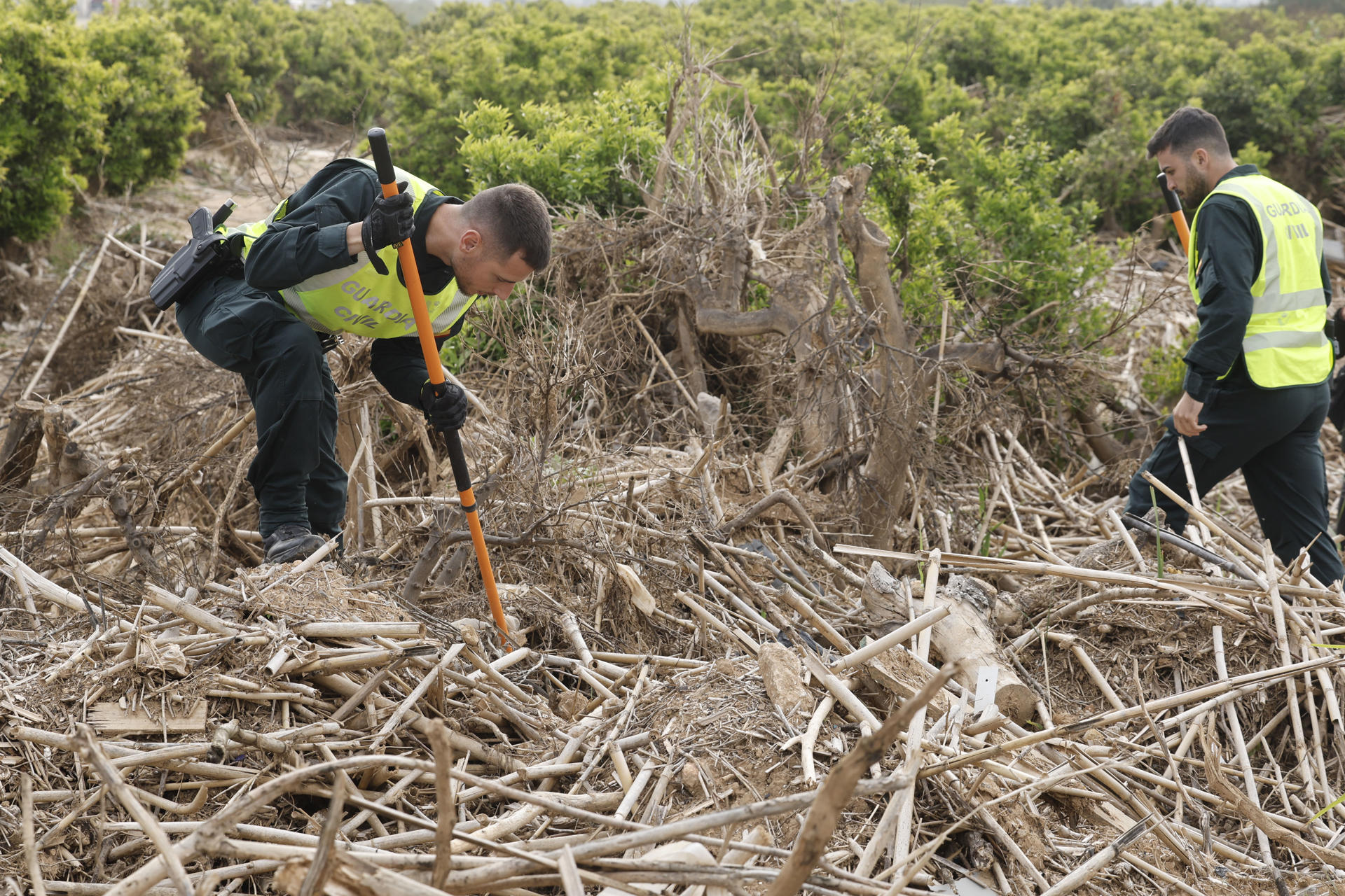 El operativo de búsqueda ha estado este jueves rastreando a pie la zona del barranco del Poyo, donde hay numerosos restos de cañas, ramas, árboles y utensilios de todo tipo que arrastró la riada y quedaron entre los naranjos situados en esta zona del término municipal de Riba-roja.