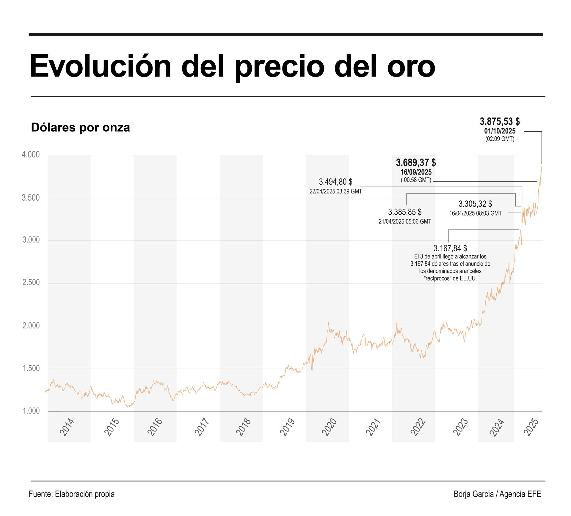 A las 10.18 hora local (8.18 GMT) el precio del oro ha tocado ese récord en 3.895,38 dólares, con una subida del 0,94 % respecto al cierre del martes (3.858,96 dólares) aunque poco después reducía su subida.