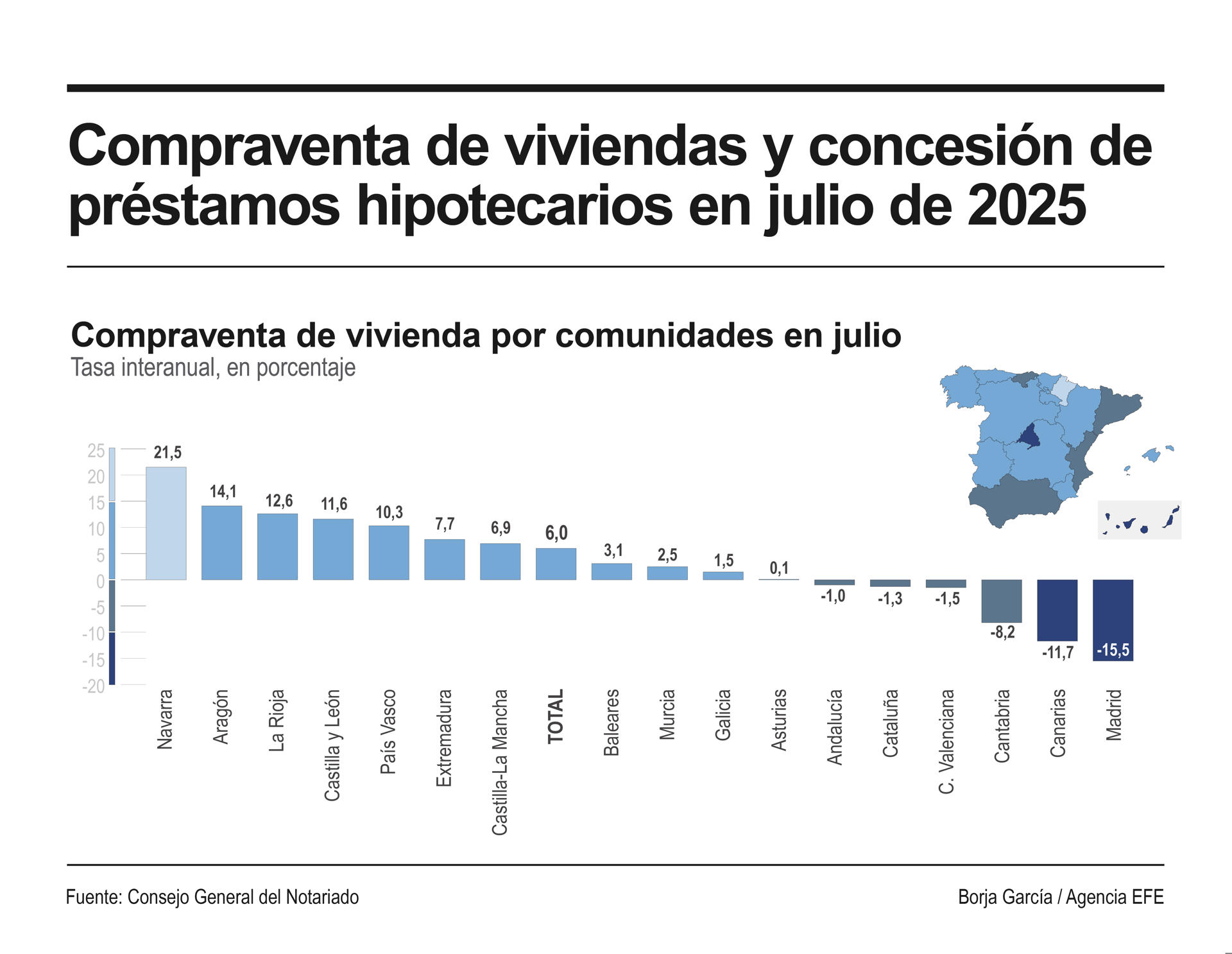 Estos datos son inferiores a los registrados un mes antes, en junio, cuando las transacciones subieron un 5,9 %, las hipotecas para vivienda crecieron un 16,6 % y los precios el 8 %. La caída en los pisos lastra las operaciones En julio se contabilizaron 71.550 compraventas de vivienda. Las de pisos disminuyeron un 3,2 % interanual hasta las 53.752 unidades. Por el contrario, las de unifamiliares se incrementaron un 6,2 % con 17.797 operaciones. Las transacciones de vivienda arrancaron 2025 con una subida del 11,5 %, un crecimiento a doble dígito que se mantuvo en febrero (10,5 %) y en marzo (19,7 %). En abril se moderaron al 1,3 % y ya en mayo cayeron un 2 %, aunque en junio repuntaron casi un 6 %. Las compraventas crecieron en julio en once comunidades autónomas y se redujo en las seis restantes. Los mayores incrementos se registraron en Navarra (21,5 %); Aragón (14,1 %); La Rioja (12,6 %); Castilla y León (11,6 %); País Vasco (10,3 %) y Extremadura (7,7 %). Con subidas más moderadas se situaron Castilla-La Mancha (6,9 %); Islas Baleares (3,1 %); Murcia (2,5 %); Galicia (1,5 %) y Asturias (0,1 %). En el extremo opuesto figuraron los descensos de la Comunidad de Madrid (-15,5 %); Canarias (-11,7 %); Cantabria (-8,2 %); Comunidad Valenciana (-1,5 %); Cataluña (-1,3 %) y Andalucía (-1 %). Navarra (24 %) y Madrid (16 %) lideran la subida de precios En julio, el precio del m² subió un 4,9 % hasta los 1.910 euros/m². En el caso de los pisos la subida fue del 8,5 % hasta los 2.193 euros/m², mientras que el precio de las viviendas unifamiliares se redujo un 1,1 % hasta los 1.437 euros/m². Las subidas se extendieron a las 17 autonomías, siendo las más significativas las de Navarra (23,9 %); Comunidad de Madrid (16 %); Cantabria (14,6 %); La Rioja (13,3 %) y Aragón (12,1 %). Con incrementos más moderados se situaron Extremadura (3,9 %); Castilla y León (3,6 %); Andalucía (3,2 %); País Vasco (3,1 %) e Islas Baleares (1,3 %), que crecieron por debajo del promedio nacional. Poco más de la mitad, el 53 %, se compraron con hipoteca Los préstamos hipotecarios para la adquisición de una vivienda crecieron un 6 % en julio hasta las 38.112 operaciones y la cuantía promedio de los mismos ascendió un 9,4 % alcanzando los 179.450 euros. El porcentaje de compras de viviendas financiadas mediante un préstamo hipotecario se situó en el 53,3 %. Además, en este tipo de compras con financiación, la cuantía del préstamo supuso de media el 72,5 % del precio. Todo ello en un contexto marcado por el abaratamiento de la financiación gracias a la progresiva relajación de los tipos de interés y la falta de producto disponible para hacer frente a una demanda de vivienda creciente, que está dificultando el acceso para los jóvenes y aquellos más vulnerables. Las hipotecas para vivienda crecieron en trece autonomías pero tuvieron descensos en Cantabria (-7,2 %), Canarias (-3,2 %), Navarra (-1,6 %) y Comunidad de Madrid (-1,4 %). Los mayores avances se registraron en Extremadura (24,5 %), La Rioja (22,4 %), Aragón (19,5 %), Asturias (16,2 %) o Cataluña (11,4 %). EFE