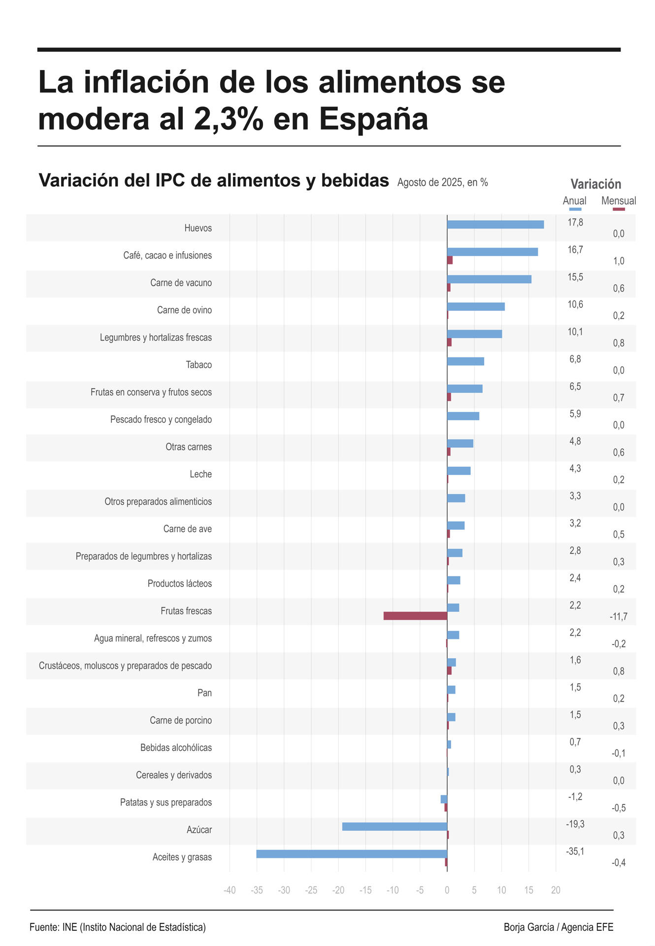 Los alimentos que más subieron en agosto respecto al mismo mes del año anterior fueron el café (20,2 %), otros aceites comestibles (18,9 %), el chocolate (18,8 %), los huevos (17,8 %), la carne de vacuno (15,5 %) y la carne de ovino y caprino (10,6 %).