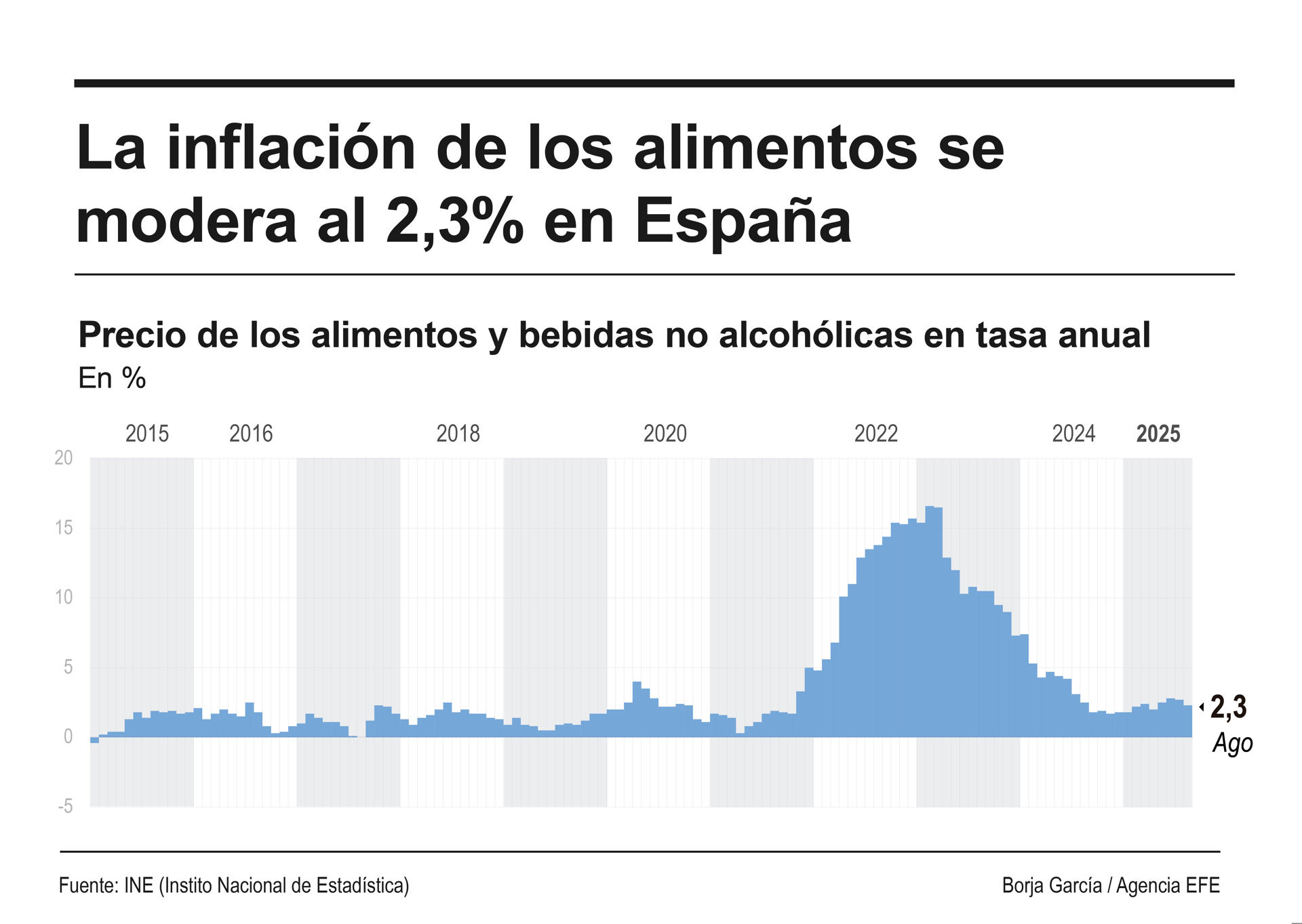 La inflación se mantuvo sin cambios en agosto tras dos meses consecutivos al alza: junio (2,3 %) y julio (2,7 %), y deja atrás la tendencia a la baja de los meses anteriores: marzo (2,3 %), abril (2,2 %) y mayo (2 %), mientras que se mantiene lejos del mínimo de septiembre de 2024 (1,5 %).
