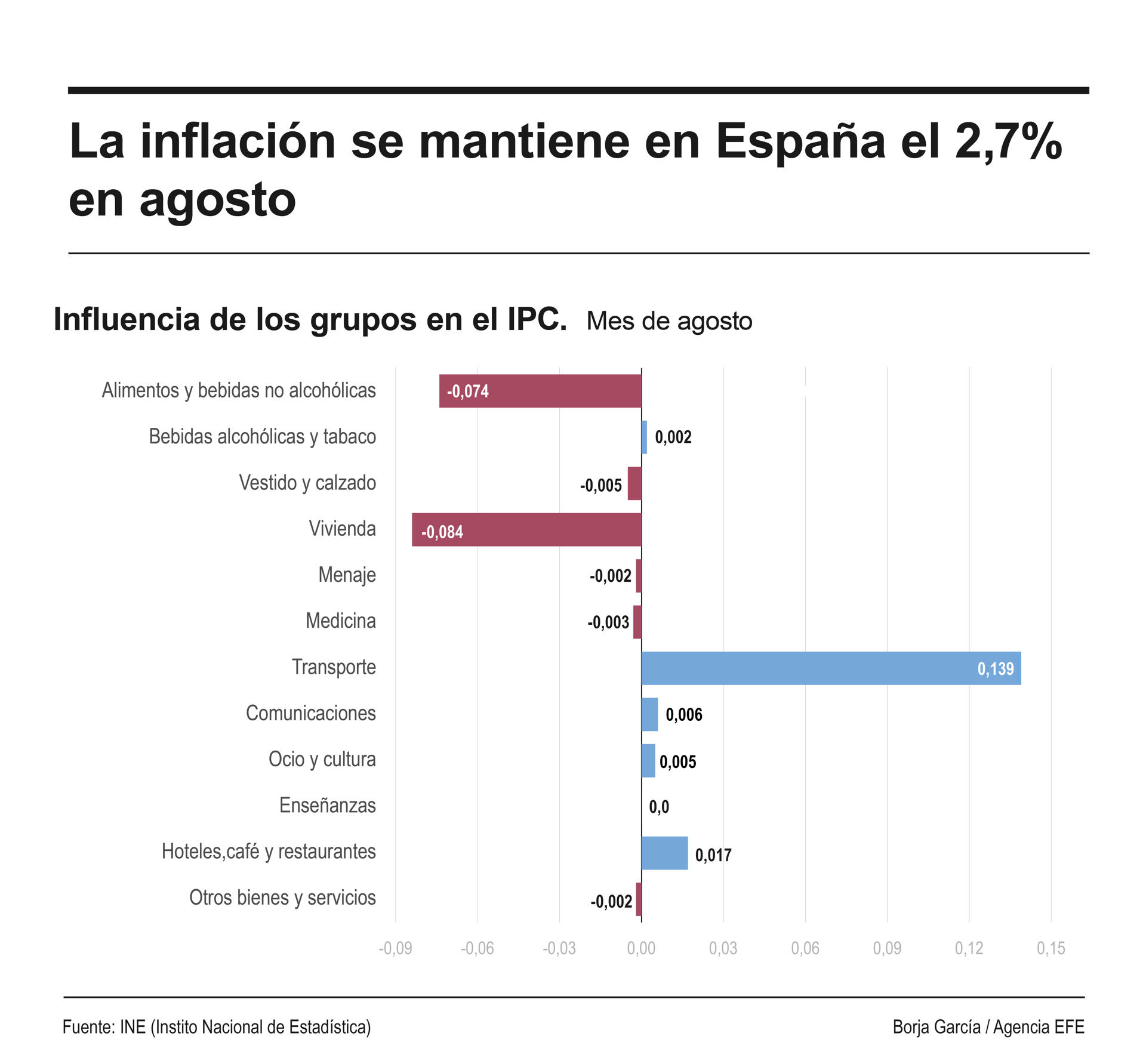 Por contra, los grupos con mayor influencia negativa fueron la vivienda, con un tasa anual que bajó siete décimas, hasta el 6 %, por el mantenimiento de los precios de la electricidad frente a la subida del año pasado, y los alimentos y bebidas no alcohólicas, con una tasa del 2,3 %, cuatro décimas inferior a la de julio.