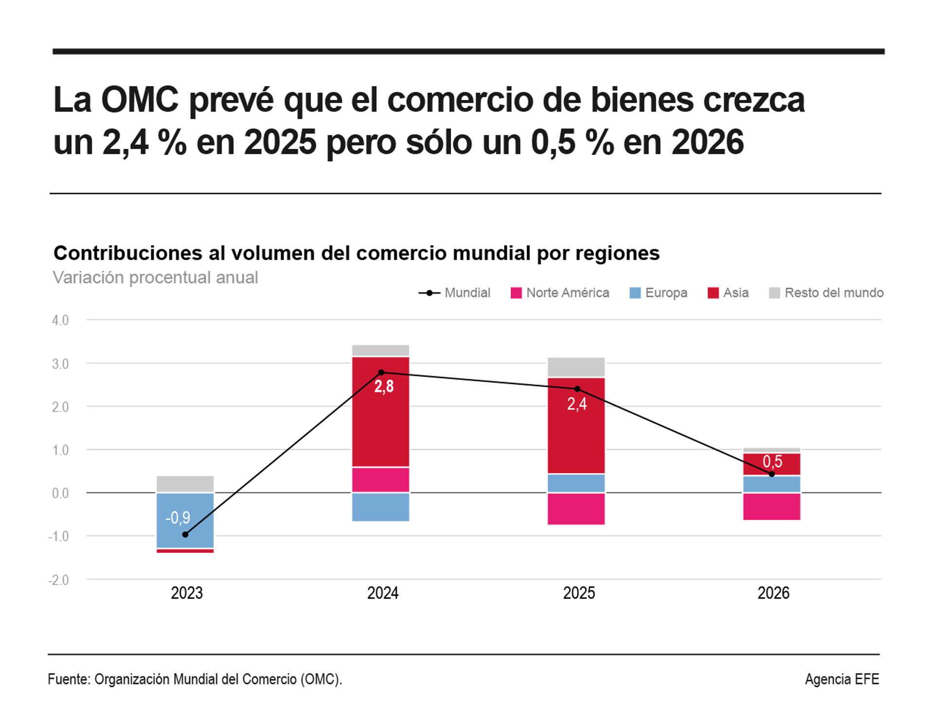 Por regiones, la OMC prevé que las exportaciones norteamericanas caigan un 3,1 % en 2025 y lo sigan haciendo en un 1 % en 2026, aunque se resentirían aún más las de Suramérica, que tras subir un 2,4 % este año podrían decrecer un 1,9 % en el siguiente.