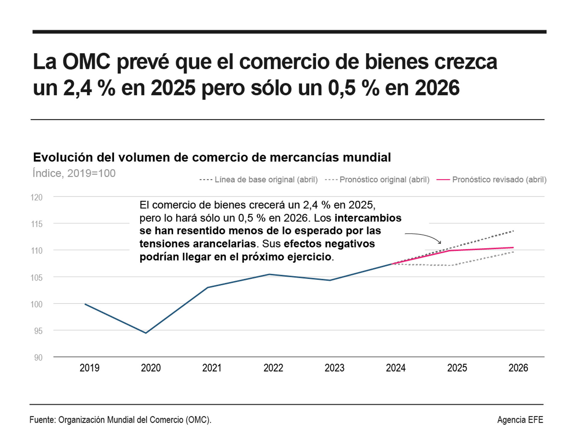 Ginebra, 7 oct (EFECOM).- El comercio global de bienes crecerá un 2,4 % en 2025 pero lo hará sólo un 0,5 % en 2026, vaticinó este martes la Organización Mundial del Comercio (OMC), cuyo nuevo informe de previsiones concluye que los intercambios se resintieron menos de lo esperado este año por las tensiones arancelarias, pero sus verdaderos efectos negativos podrían llegar en el próximo ejercicio.