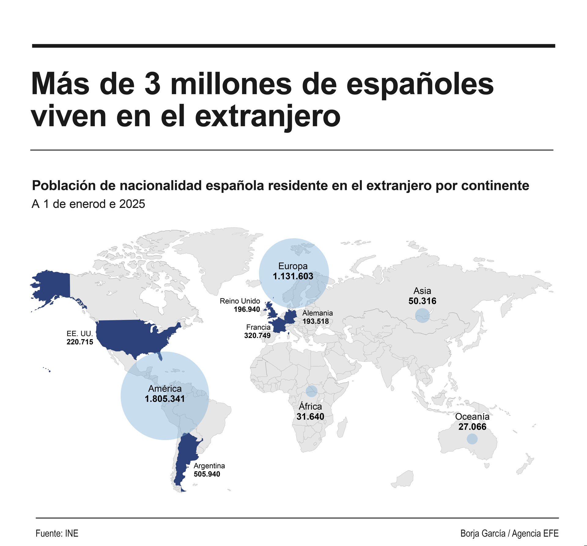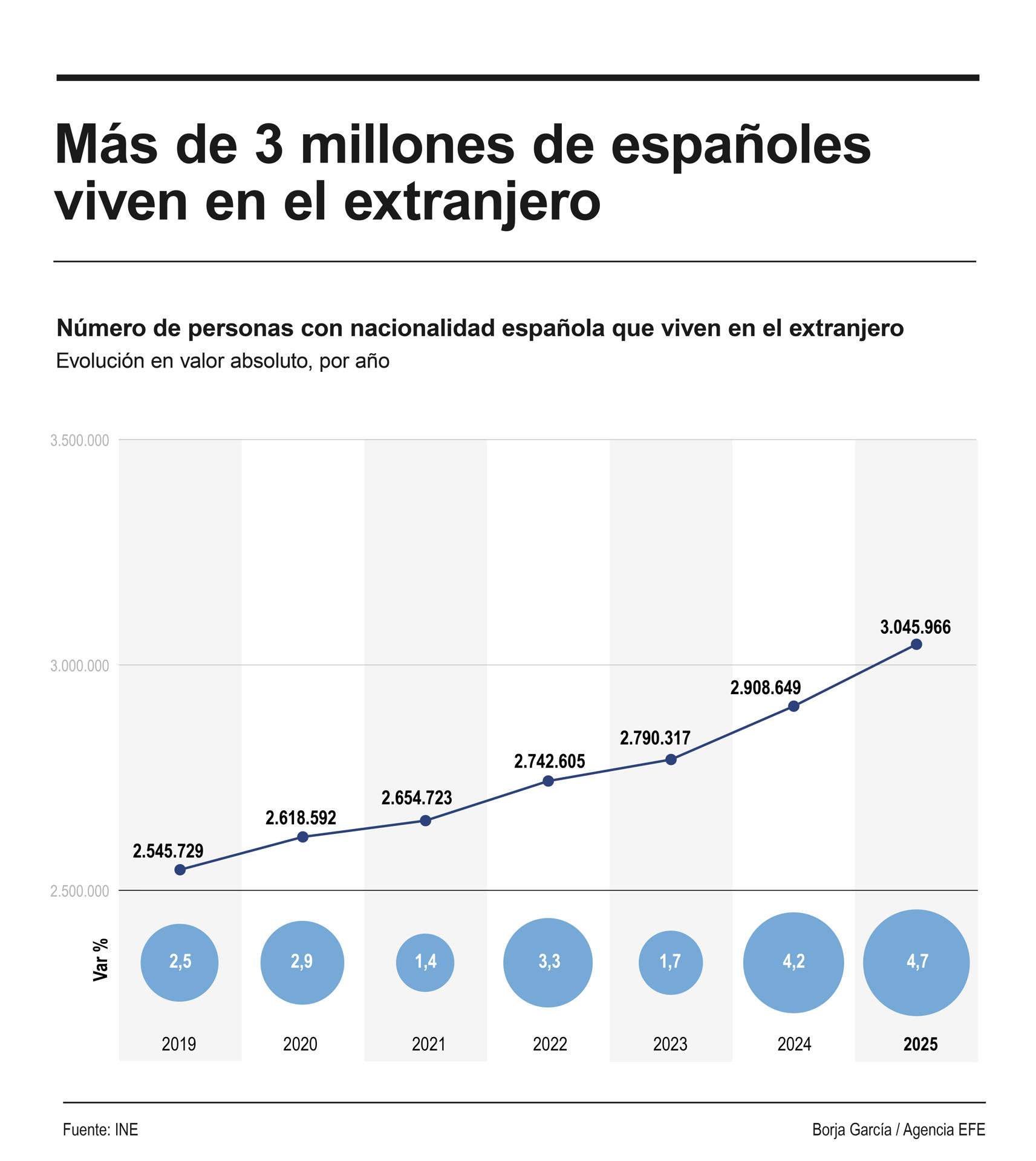 Madrid, 19 mar (EFE).- El número de personas con nacionalidad española que viven en el extranjero ha superado los 3 millones a 1 de enero de 2025, lo que supone un incremento de 4,7% con respecto al año anterior, según los datos publicados este miércoles por el Instituto Nacional de Estadística (INE).